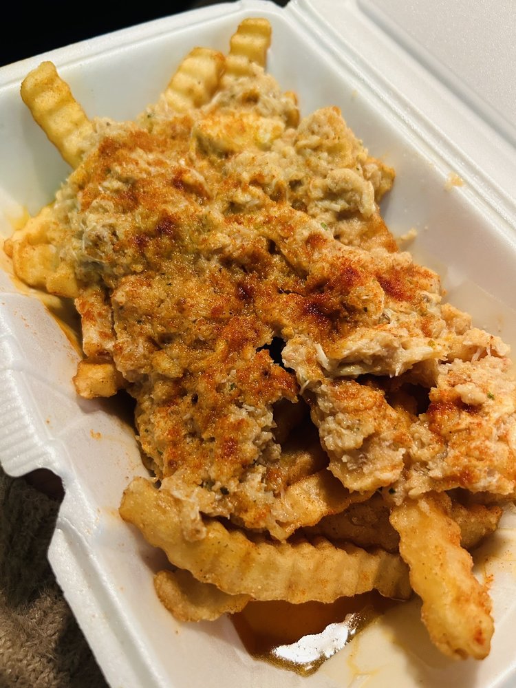 Sauteed crab meat, buttered garlic sauce, served over fries.